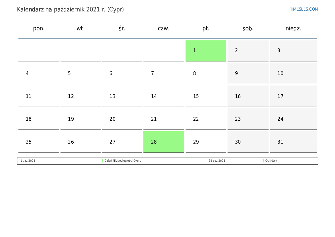 Pobierz i wydrukuj kalendarz PDF ze świętami i weekendami na październik 2021 r. dla Cypru
