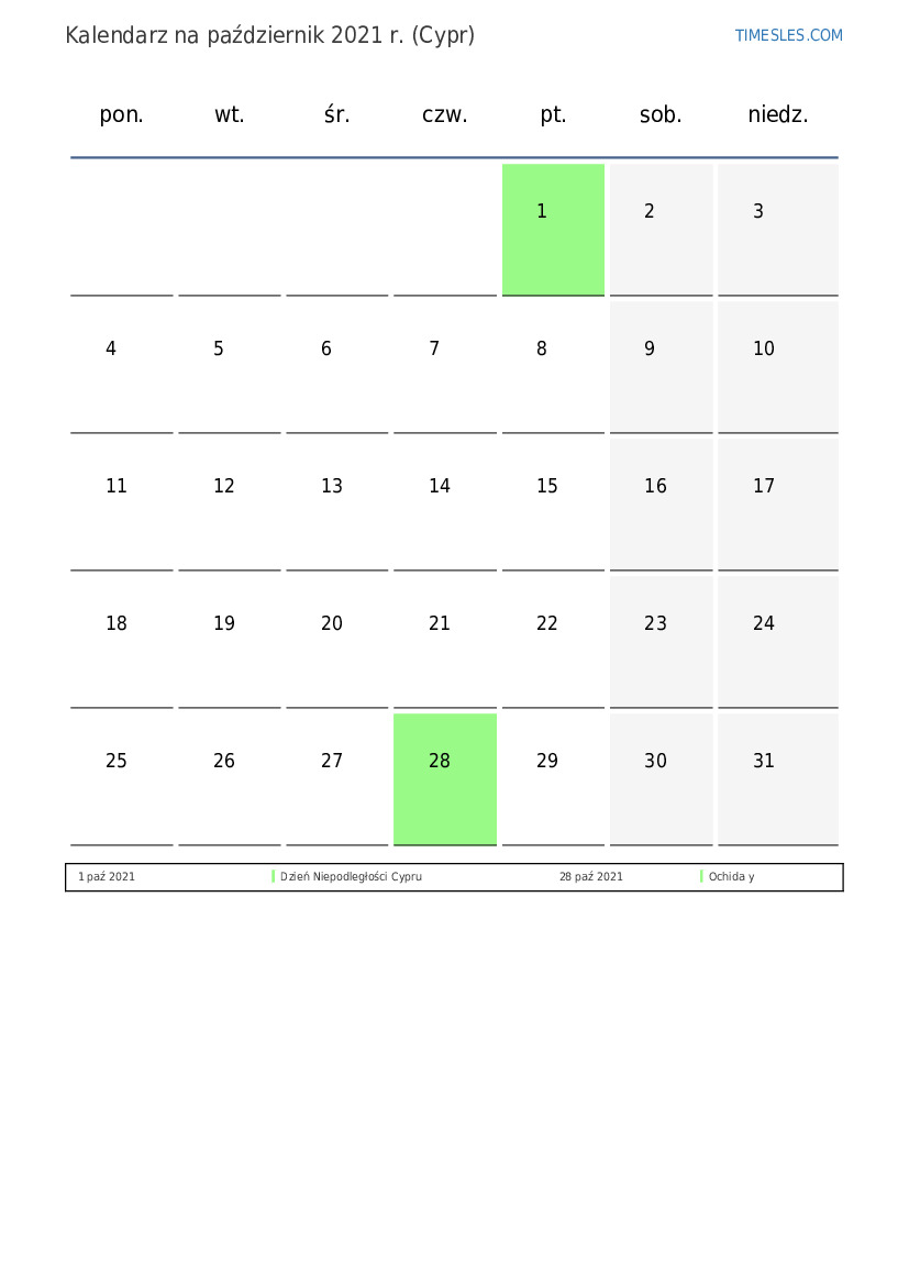 Kalendarz świąt i weekendów na październik 2021 r. dla Cypru