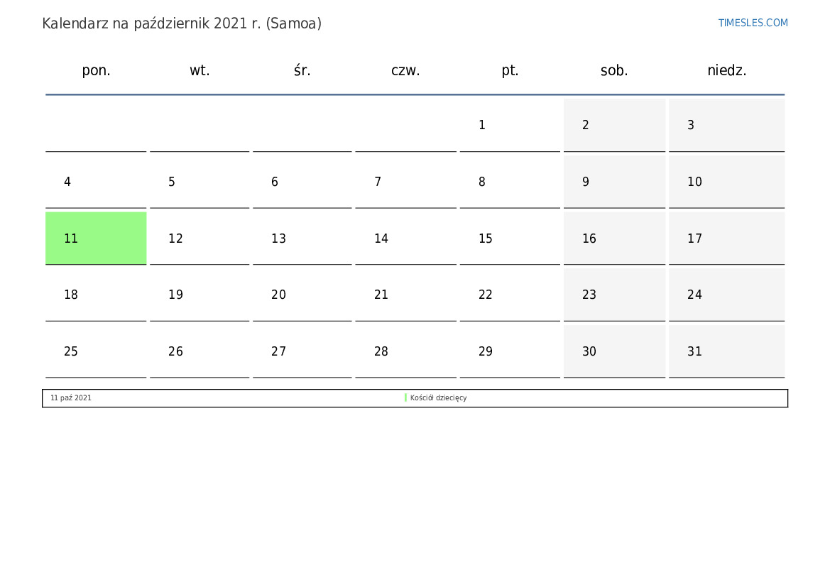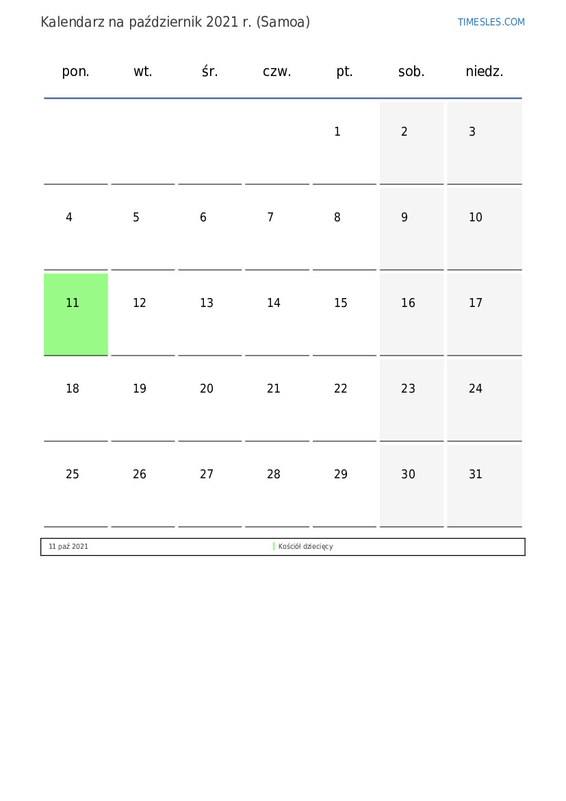 Pobierz i wydrukuj kalendarz PDF ze świętami i weekendami na październik 2021 r. dla Samoa