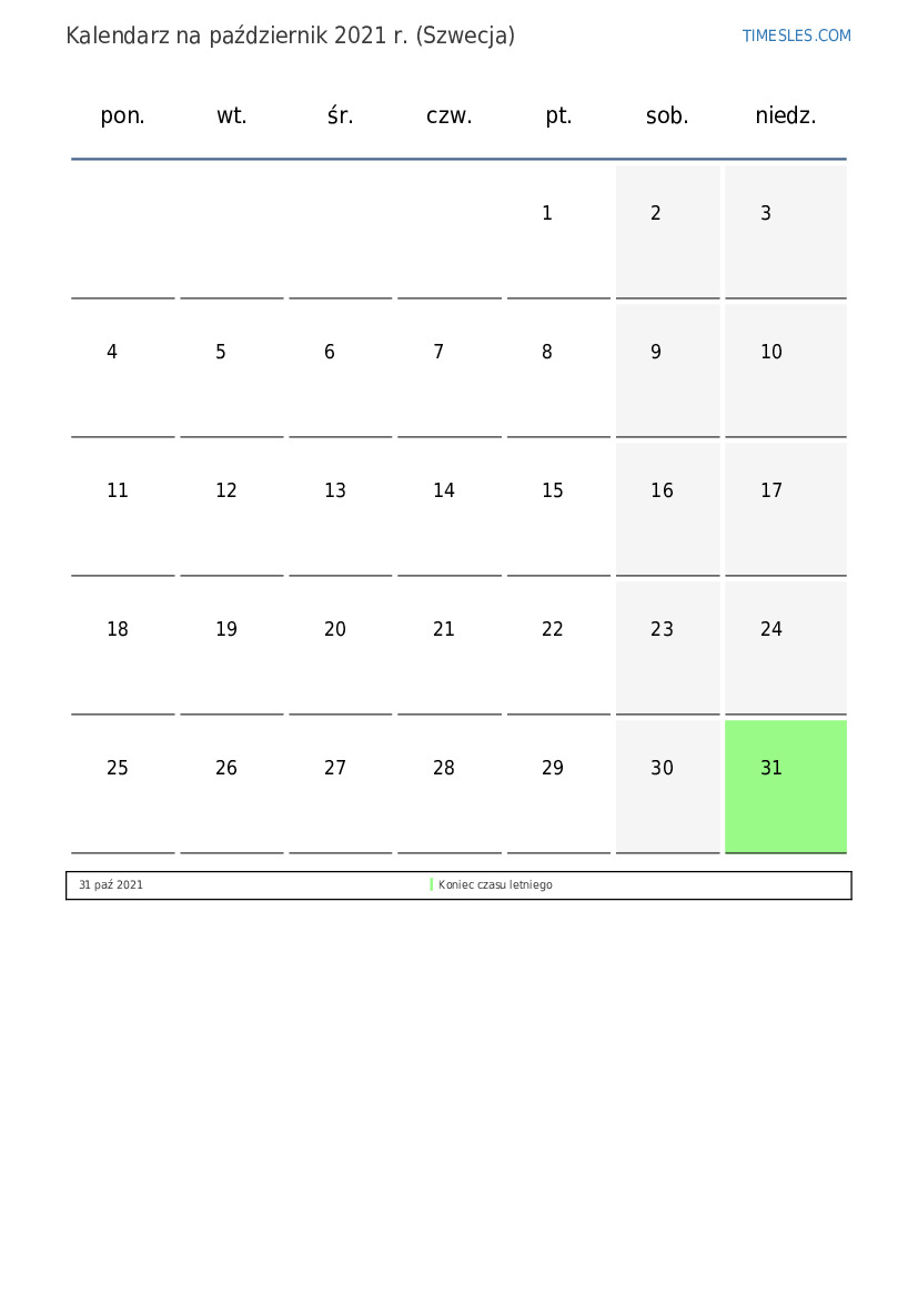 Pobierz i wydrukuj kalendarz PDF ze świętami i weekendami na październik 2021 r. dla Szwecji