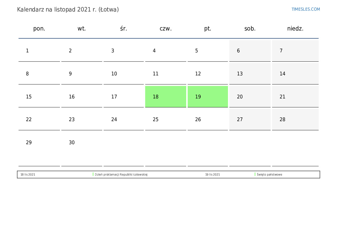 Pobierz i wydrukuj kalendarz PDF ze świętami i weekendami na listopad 2021 r. dla Łotwy