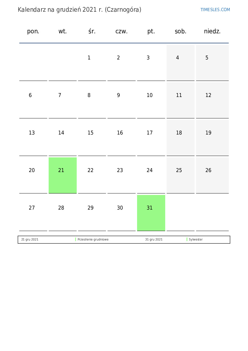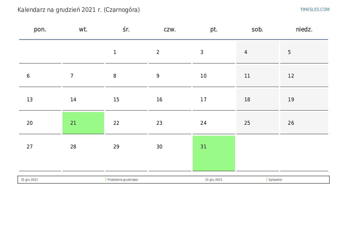 Pobierz i wydrukuj kalendarz PDF ze świętami i weekendami na grudzień 2021 r. dla Czarnogóry