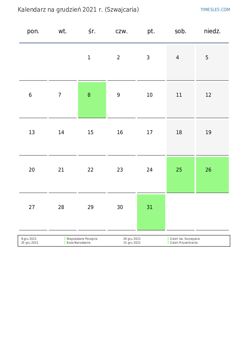 Kalendarz świąt i weekendów na grudzień 2021 r. dla Szwajcarii