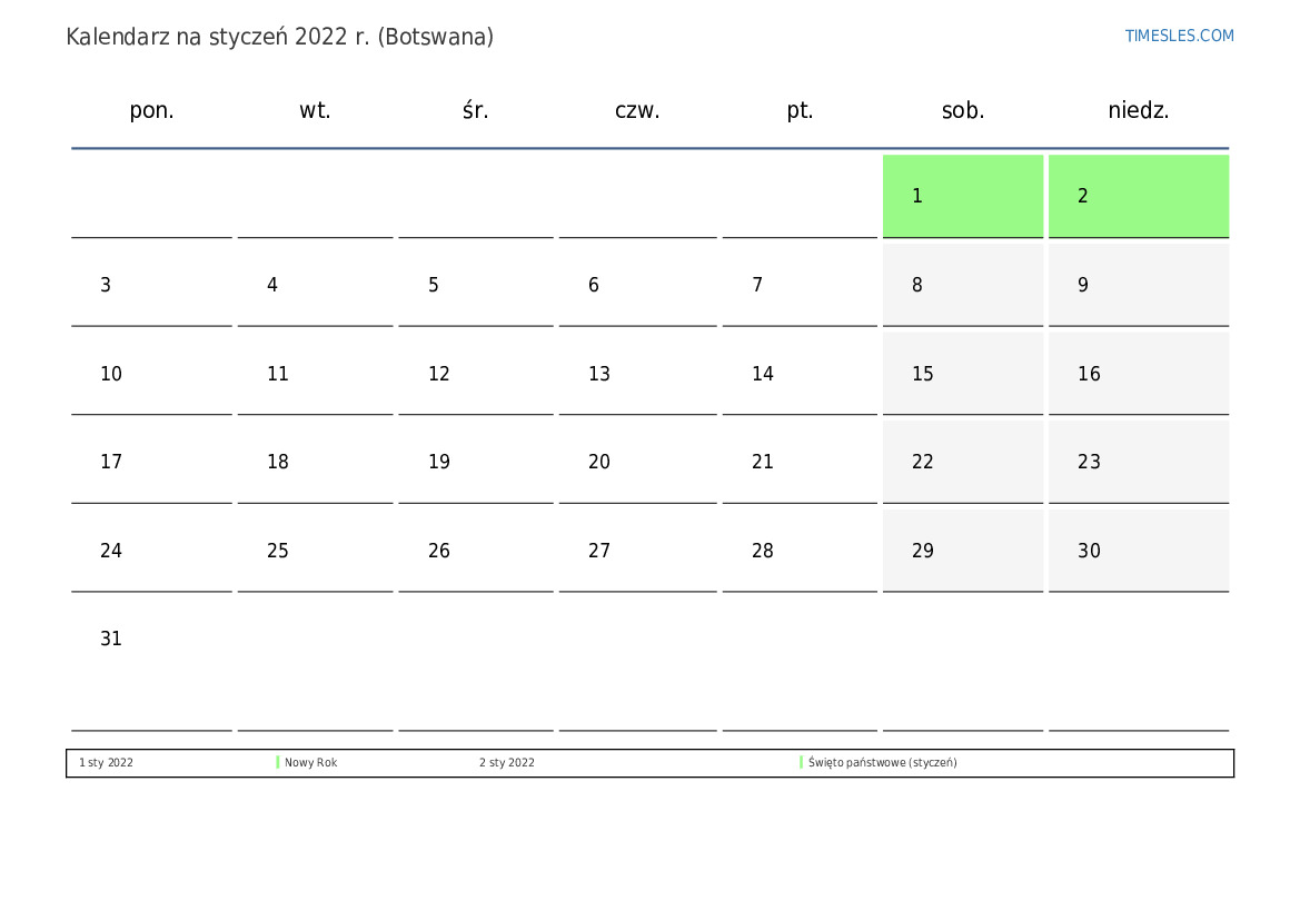 Pobierz i wydrukuj kalendarz PDF ze świętami i weekendami na styczeń 2022 r. dla Botswany