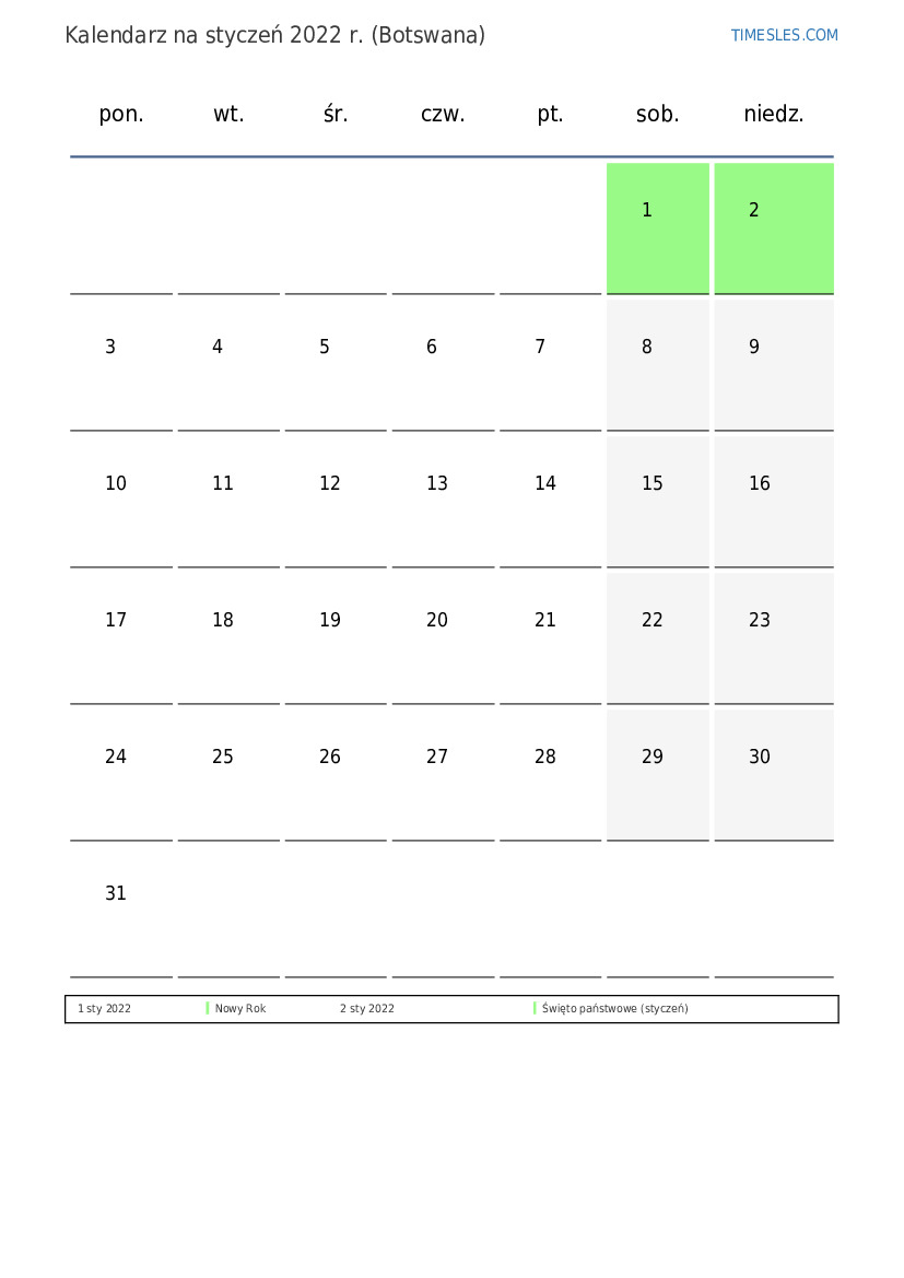 Kalendarz świąt i weekendów na styczeń 2022 r. dla Botswany