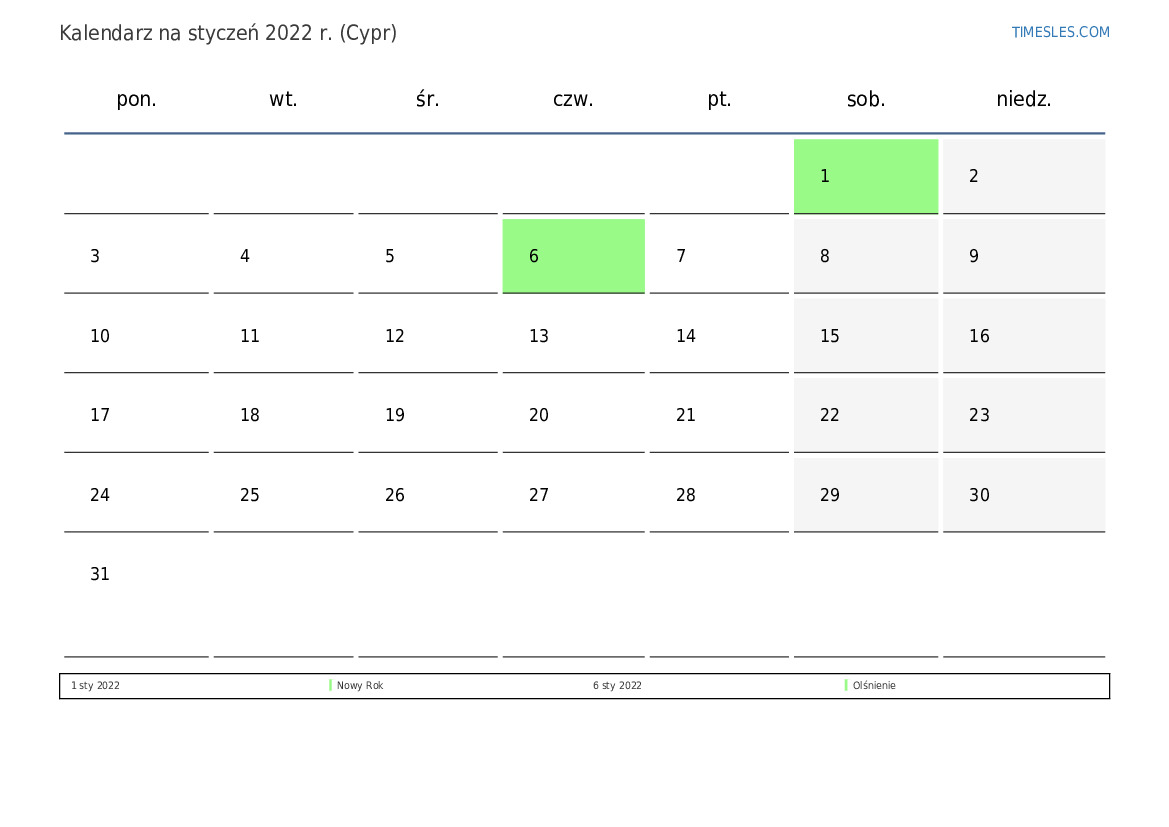 Pobierz i wydrukuj kalendarz PDF ze świętami i weekendami na styczeń 2022 r. dla Cypru