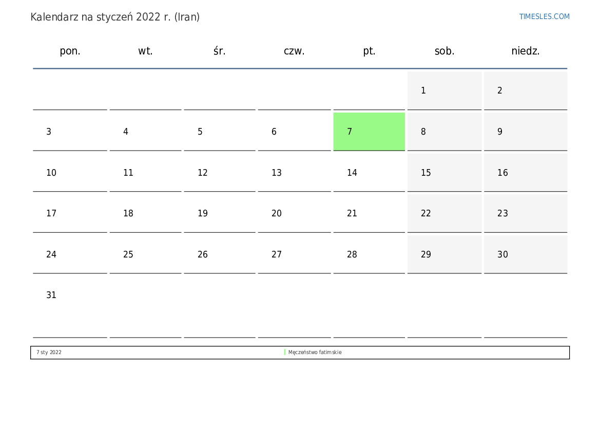 Pobierz i wydrukuj kalendarz PDF ze świętami i weekendami na styczeń 2022 r. dla Iranu