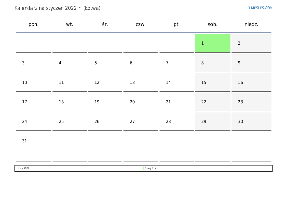Pobierz i wydrukuj kalendarz PDF ze świętami i weekendami na styczeń 2022 r. dla Łotwy