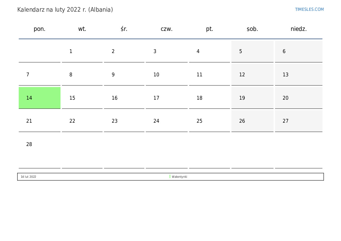 Pobierz i wydrukuj kalendarz PDF ze świętami i weekendami na luty 2022 r. dla Albanii