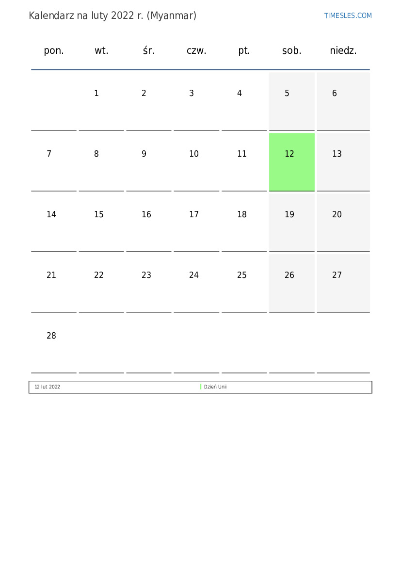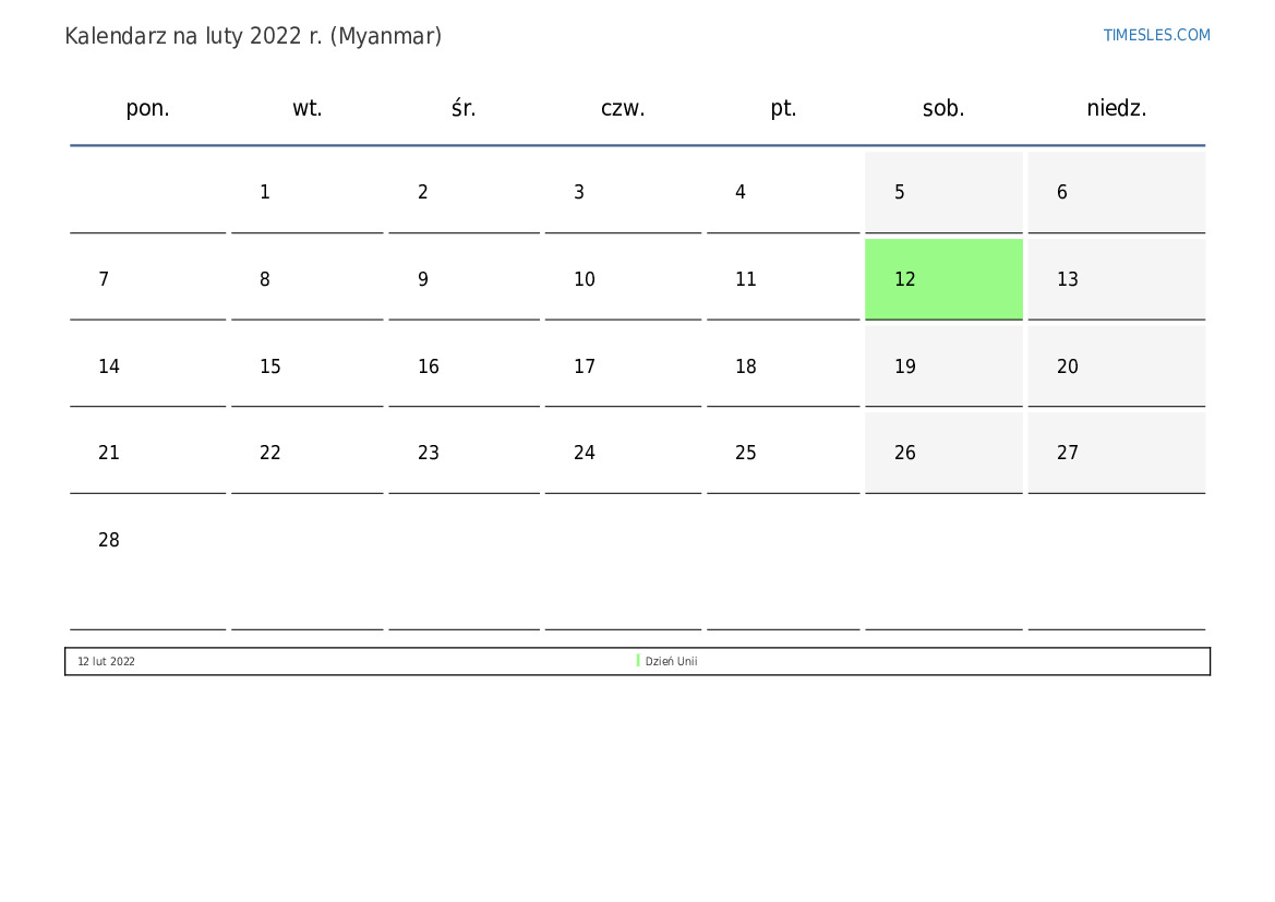 Pobierz i wydrukuj kalendarz PDF ze świętami i weekendami na luty 2022 r. dla Myanmaru