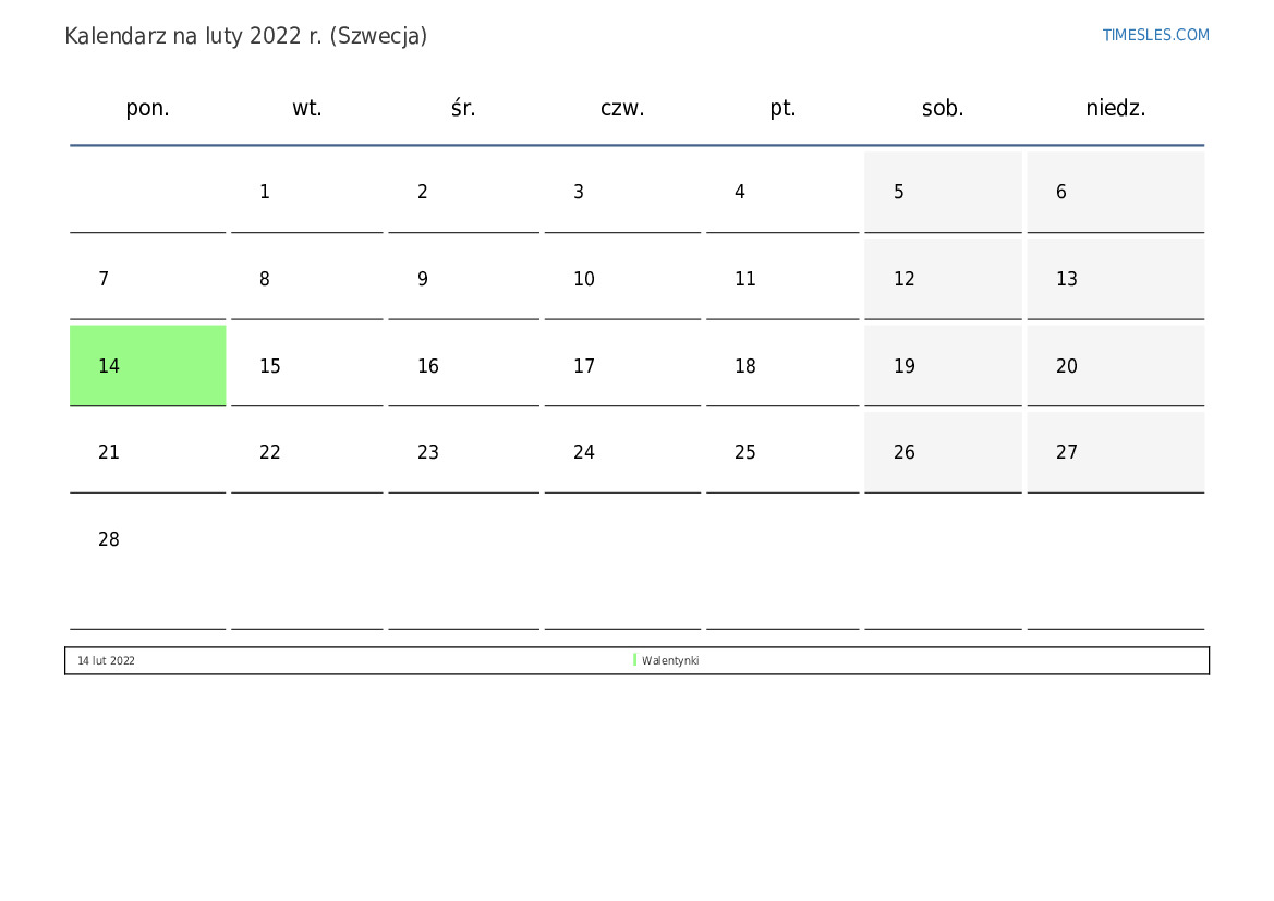 Pobierz i wydrukuj kalendarz PDF ze świętami i weekendami na luty 2022 r. dla Szwecji
