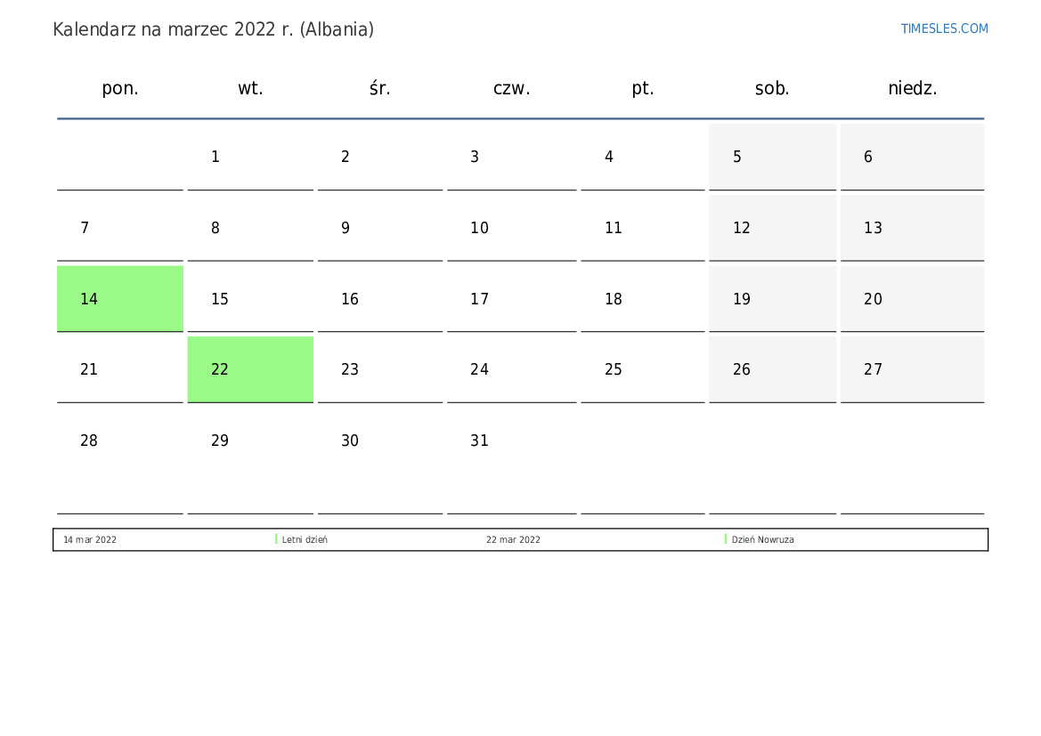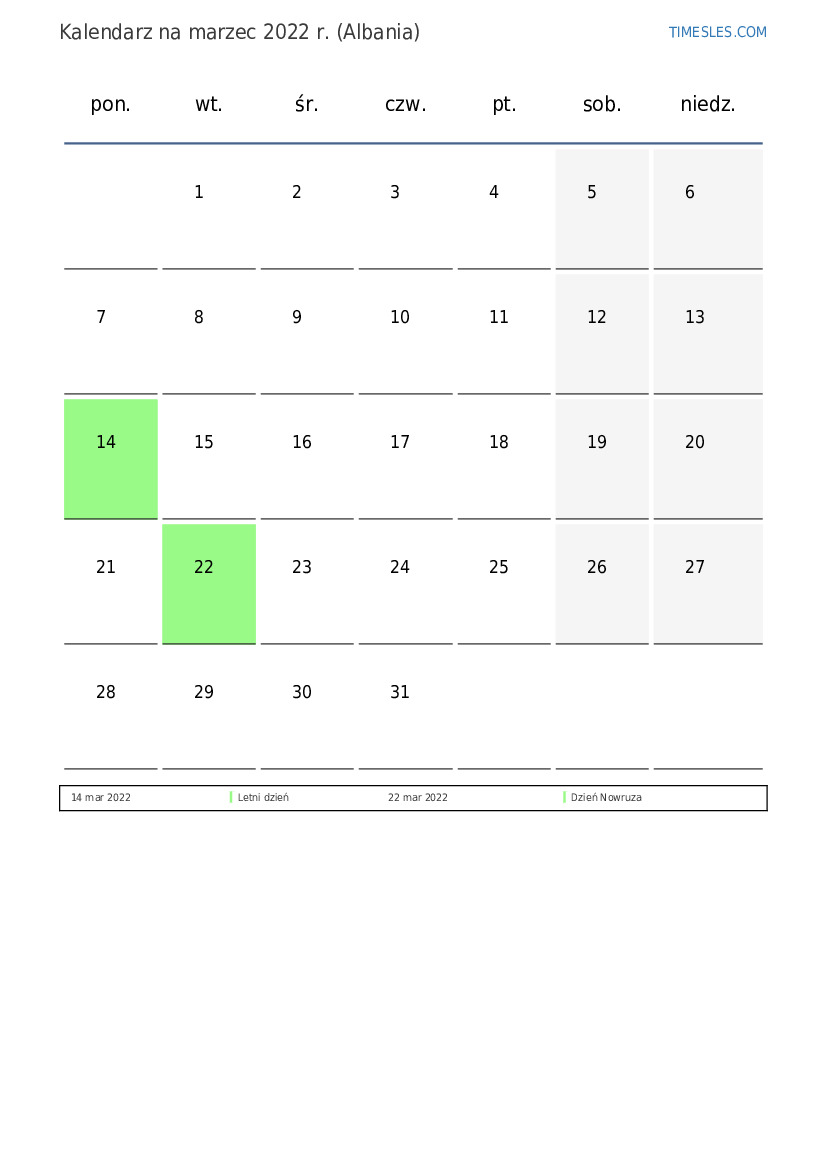 Pobierz i wydrukuj kalendarz PDF ze świętami i weekendami na marzec 2022 r. dla Albanii