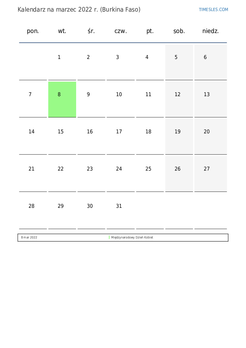 Kalendarz na marzec 2022 r. dla Burkina Faso