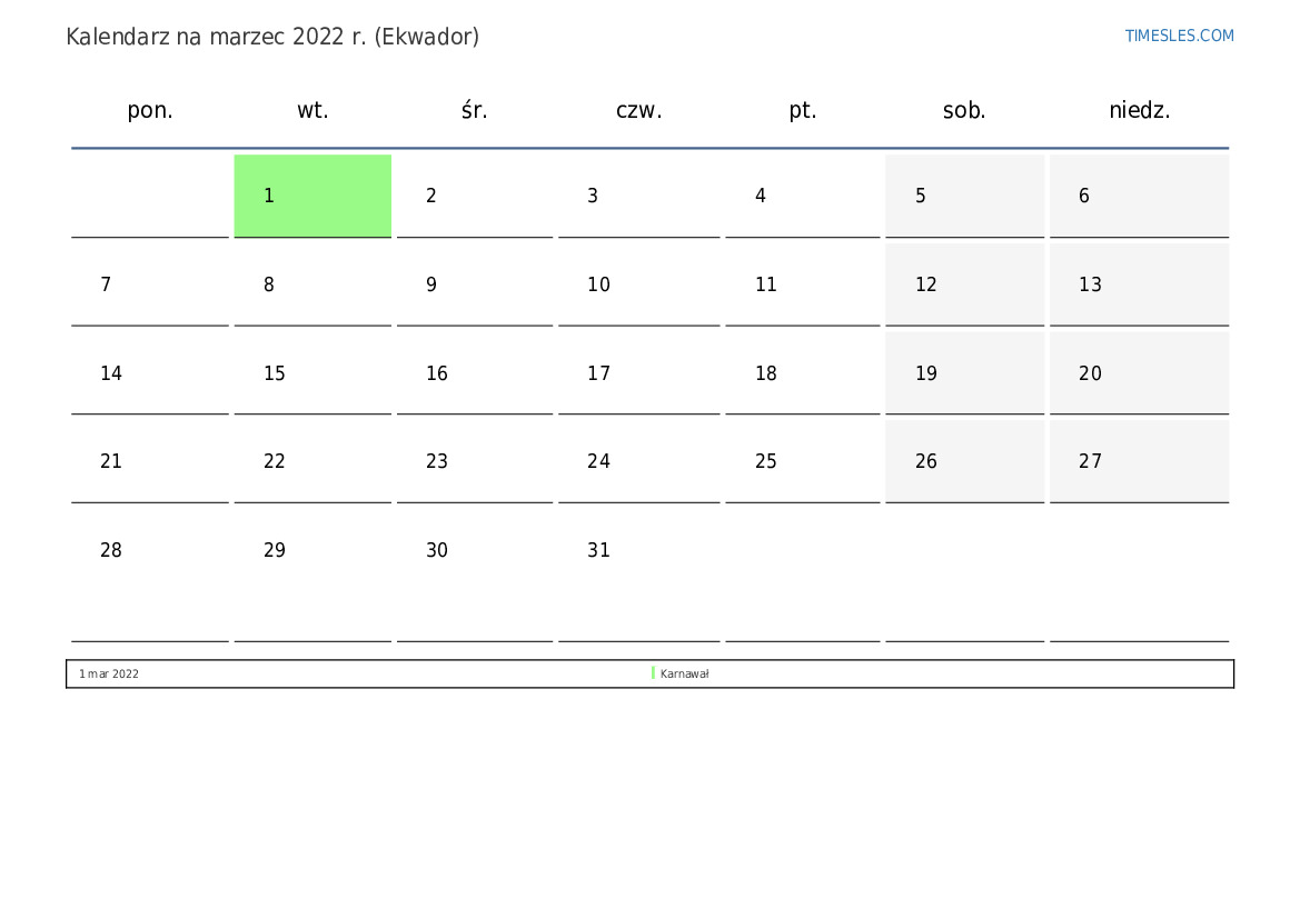 Kalendarz na marzec 2022 r. dla Ekwadoru