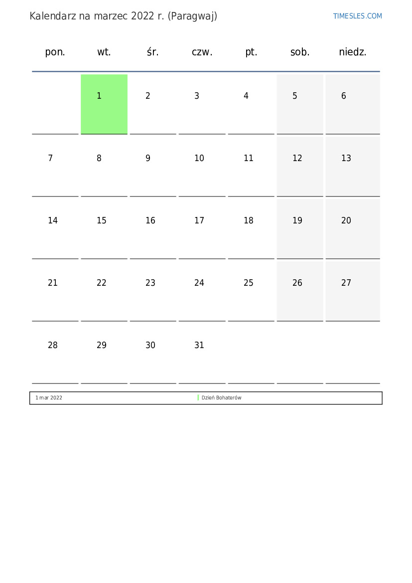 Kalendarz na marzec 2022 r. dla Paragwaju