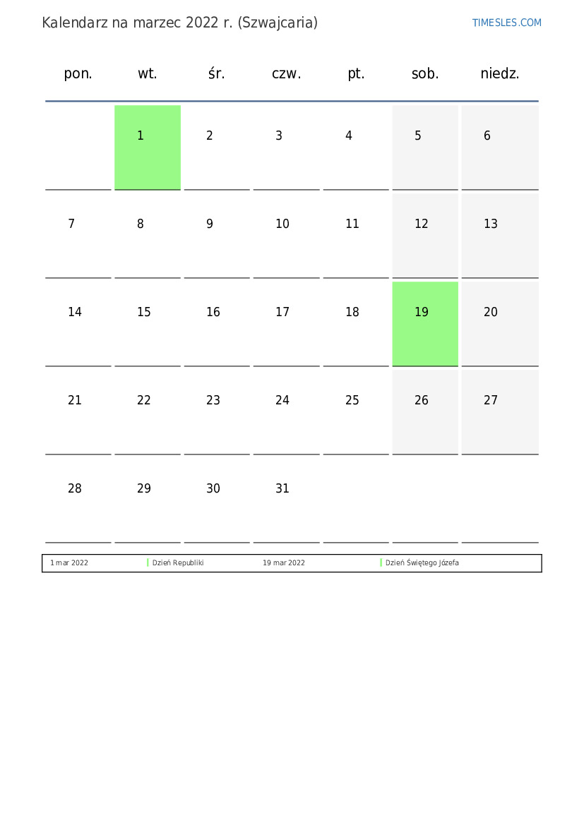Kalendarz na marzec 2022 r. dla Szwajcarii