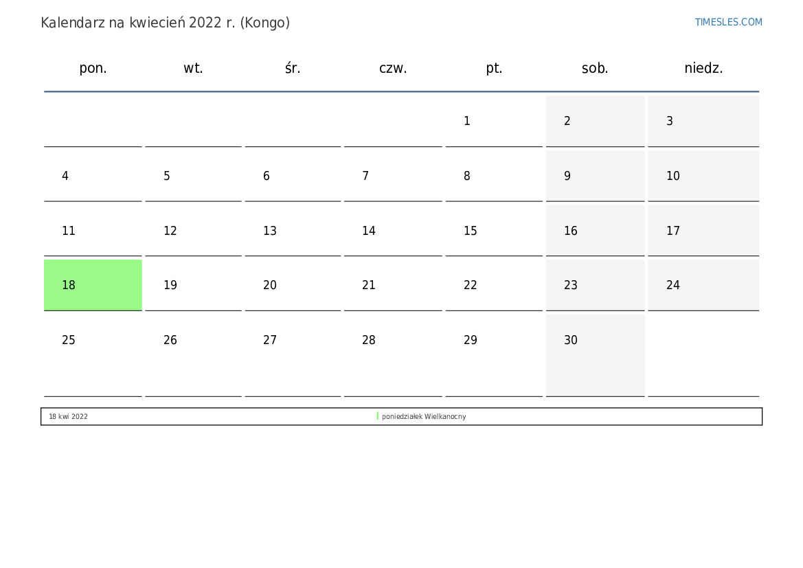 Pobierz i wydrukuj kalendarz PDF ze świętami i weekendami na kwiecień 2022 r. dla Konga
