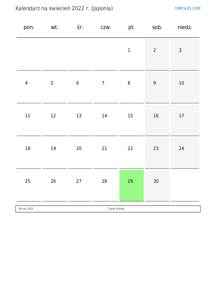 Pobierz i wydrukuj kalendarz PDF ze świętami i weekendami na kwiecień 2022 r. dla Japonii