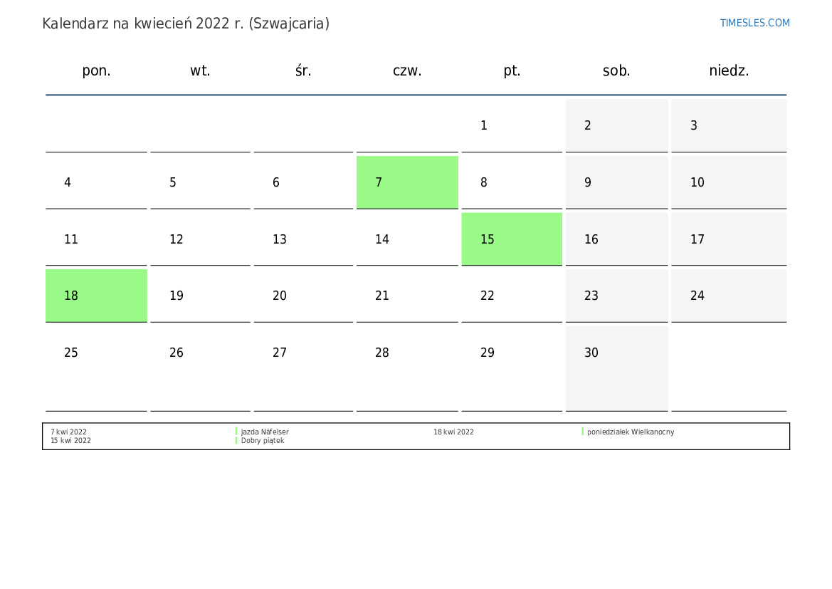 Pobierz i wydrukuj kalendarz PDF ze świętami i weekendami na kwiecień 2022 r. dla Szwajcarii