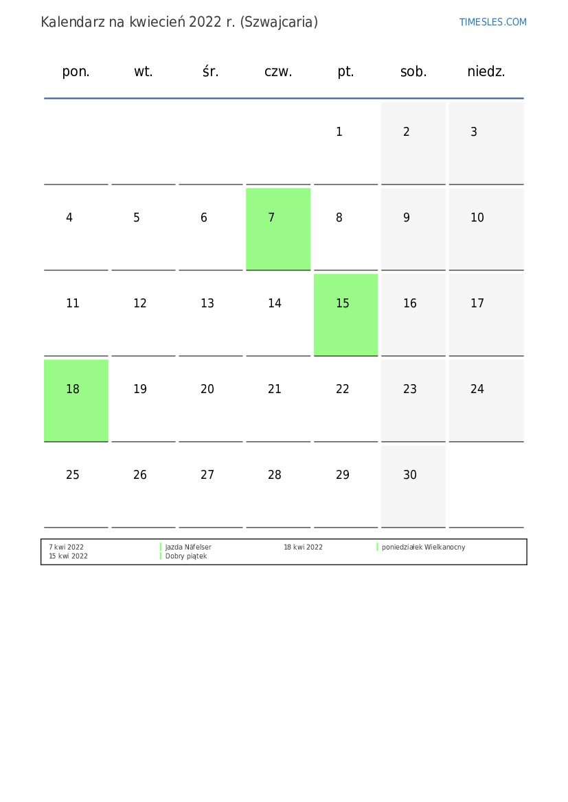 Kalendarz świąt i weekendów na kwiecień 2022 r. dla Szwajcarii