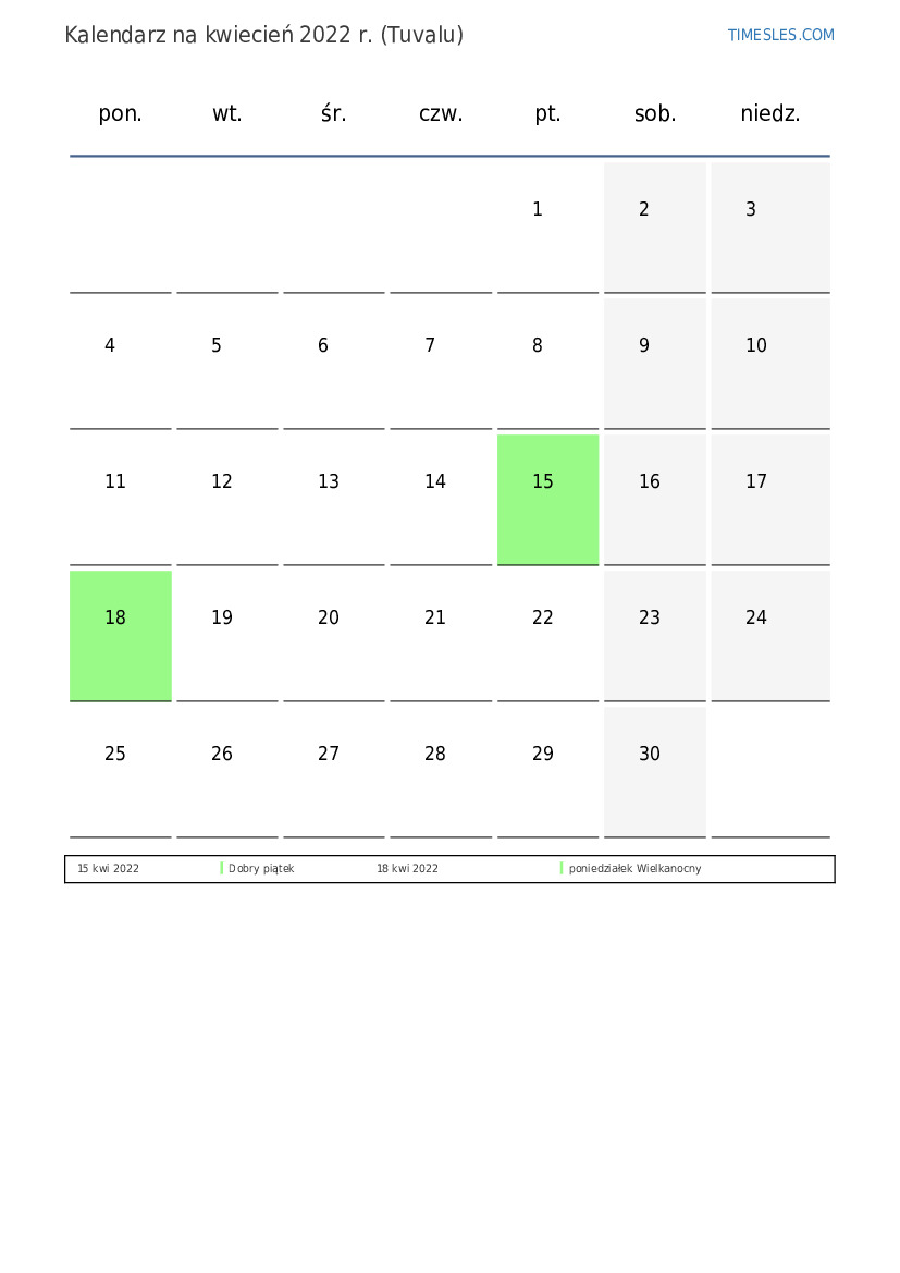 Pobierz i wydrukuj kalendarz PDF ze świętami i weekendami na kwiecień 2022 r. dla Tuvalu