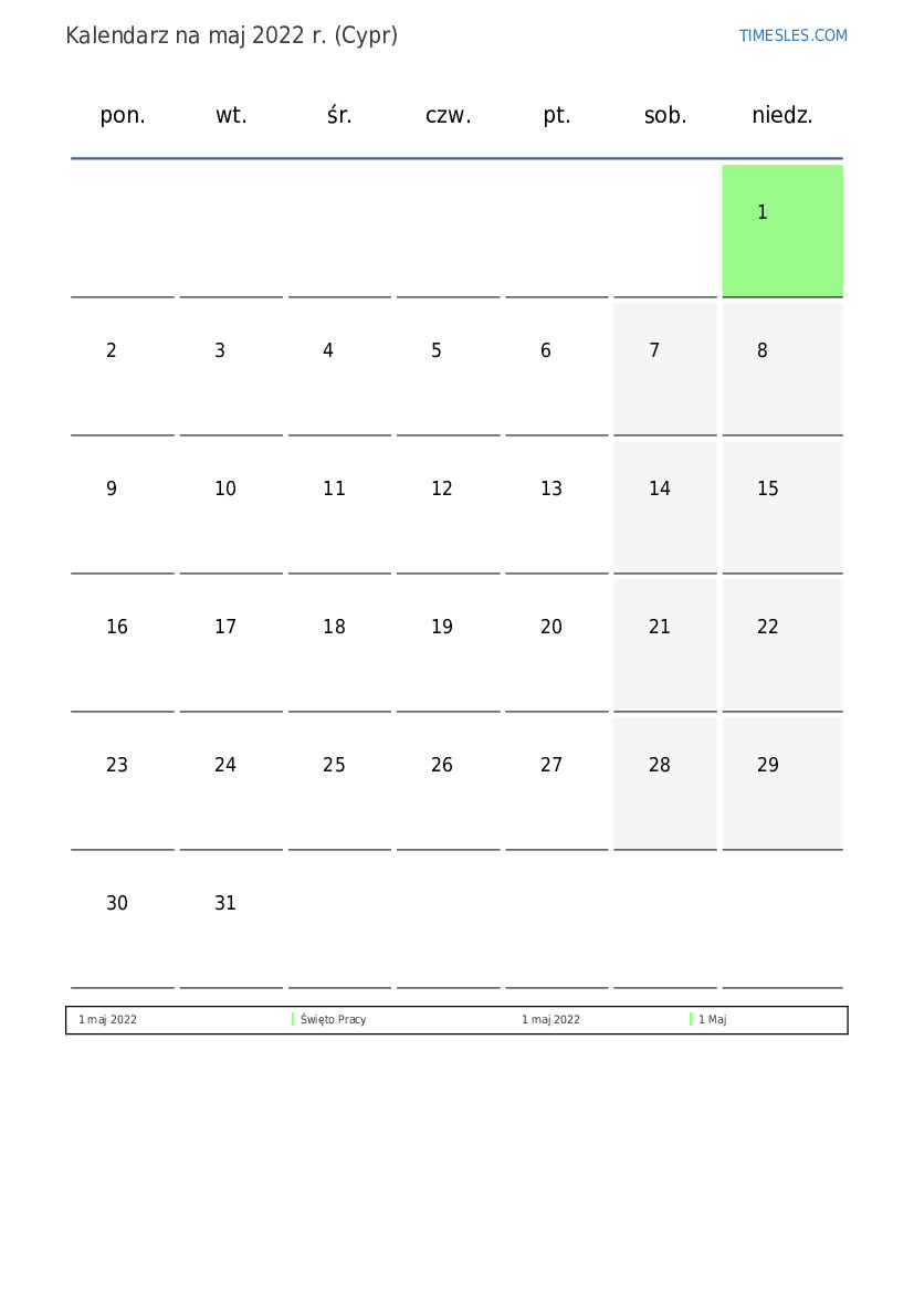 Pobierz i wydrukuj kalendarz PDF ze świętami i weekendami na maj 2022 r. dla Cypru