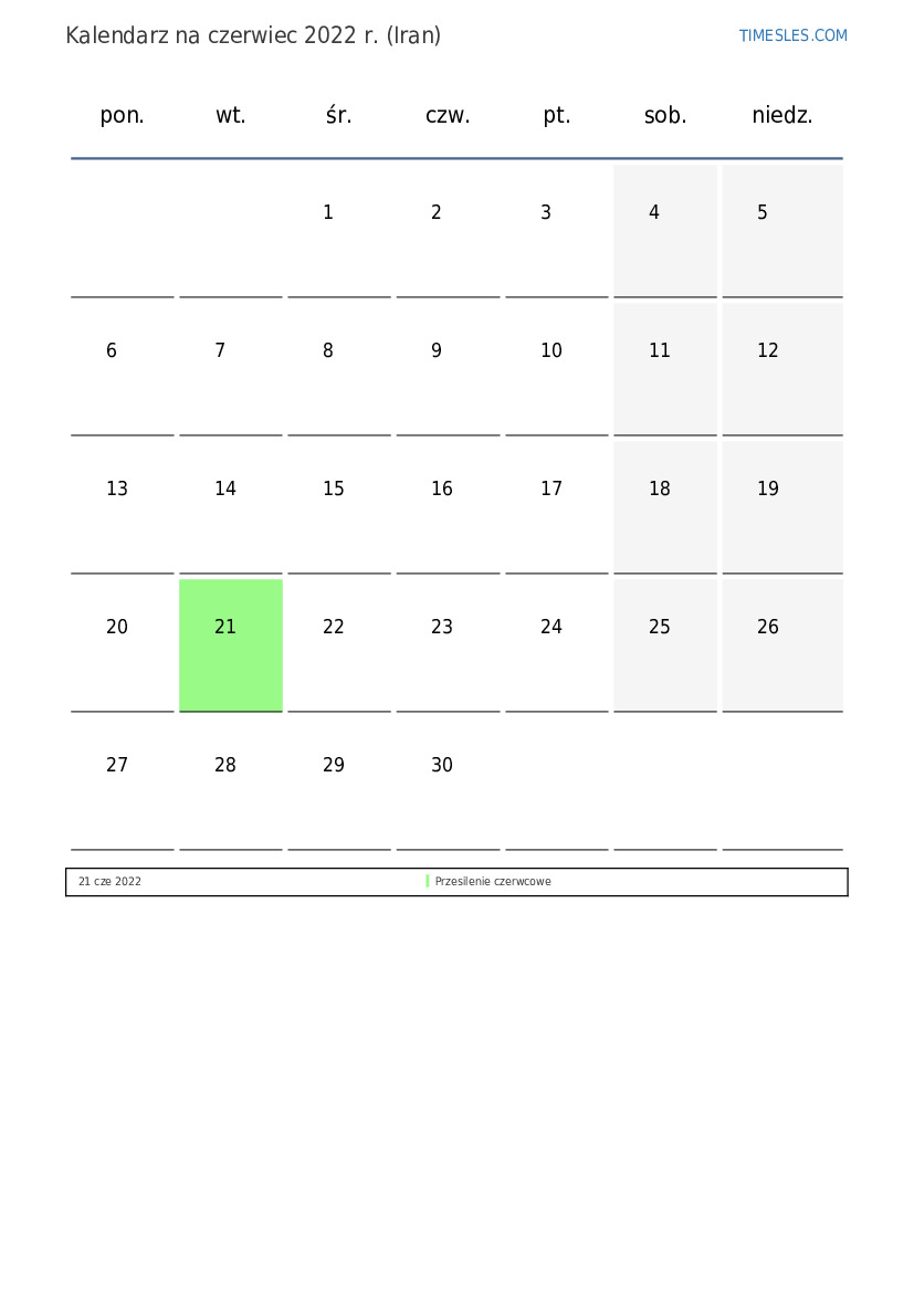 Pobierz i wydrukuj kalendarz PDF ze świętami i weekendami na czerwiec 2022 r. dla Iranu