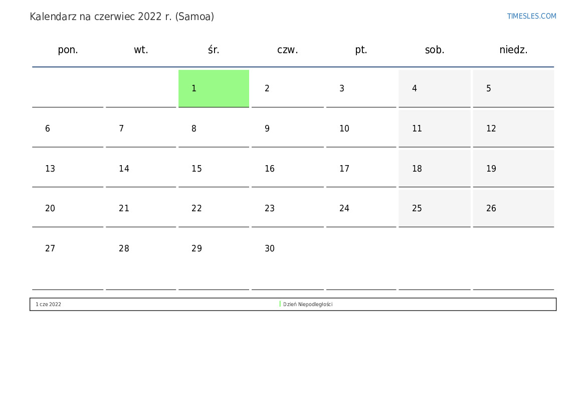 Pobierz i wydrukuj kalendarz PDF ze świętami i weekendami na czerwiec 2022 r. dla Samoa