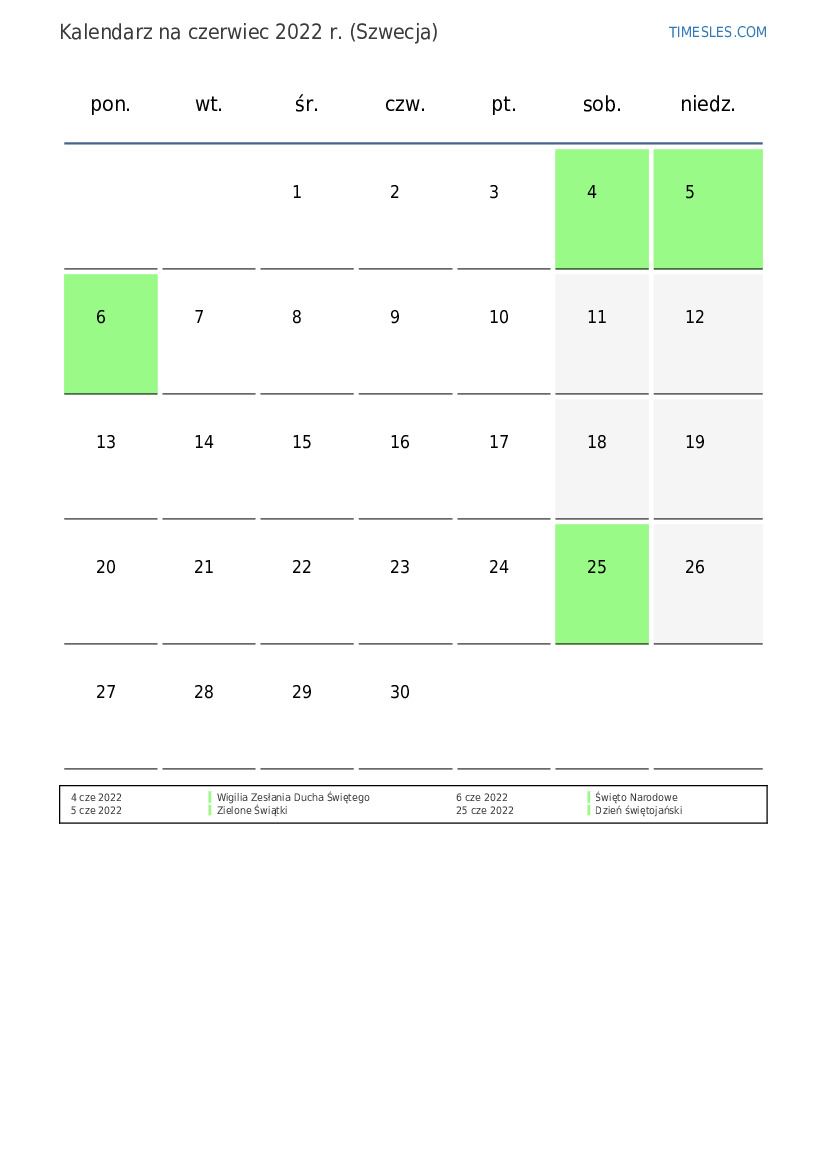 Kalendarz na czerwiec 2022 r. dla Szwecji
