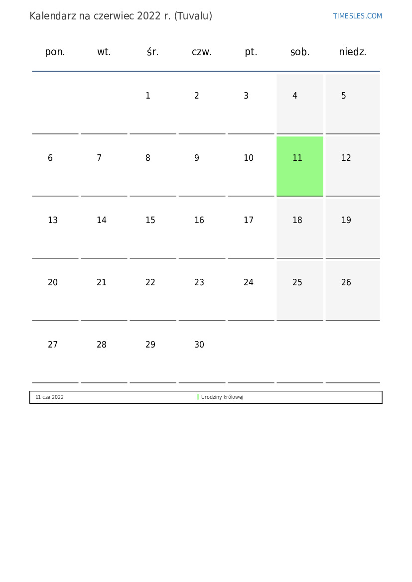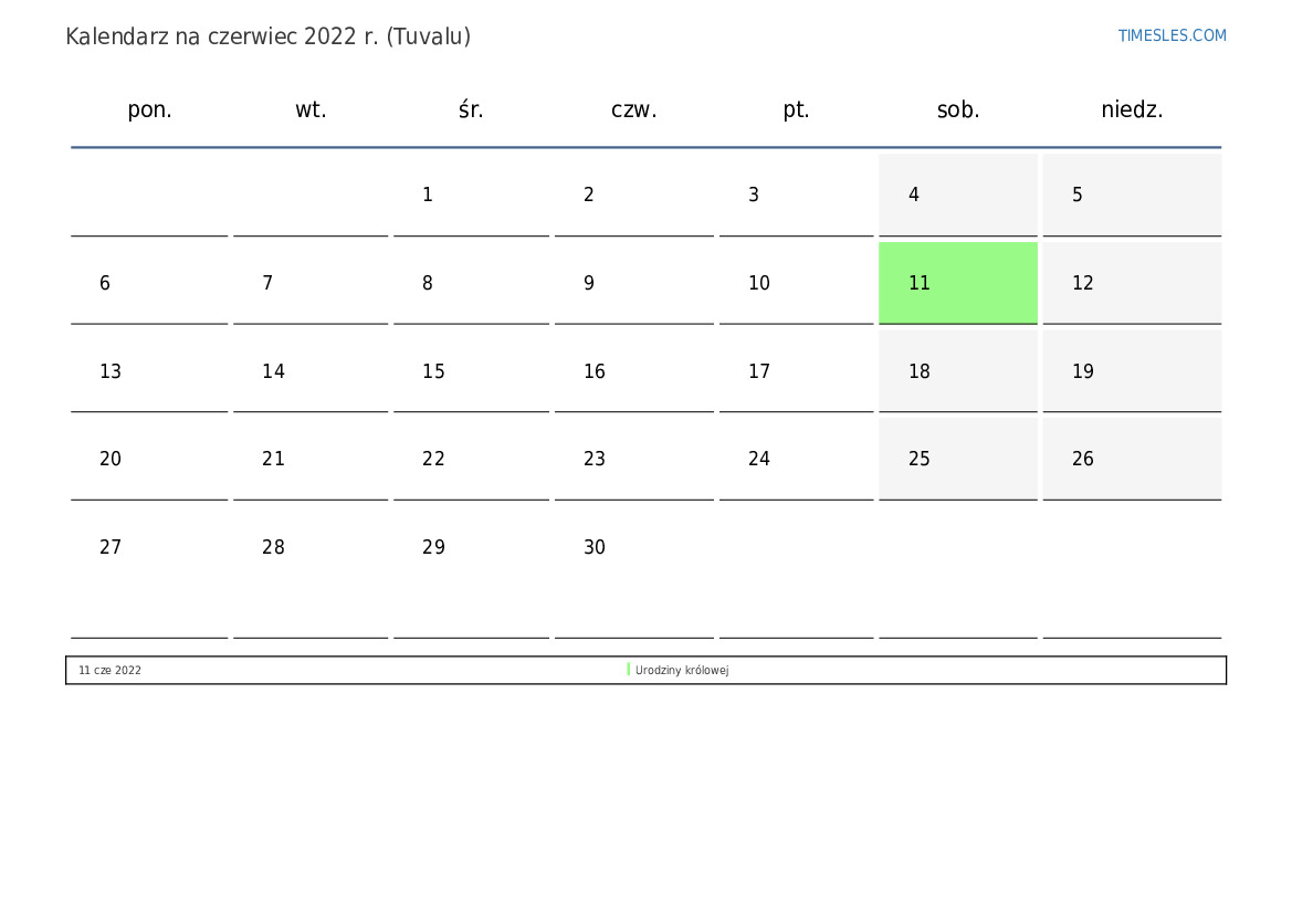 Pobierz i wydrukuj kalendarz PDF ze świętami i weekendami na czerwiec 2022 r. dla Tuvalu