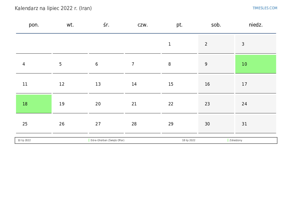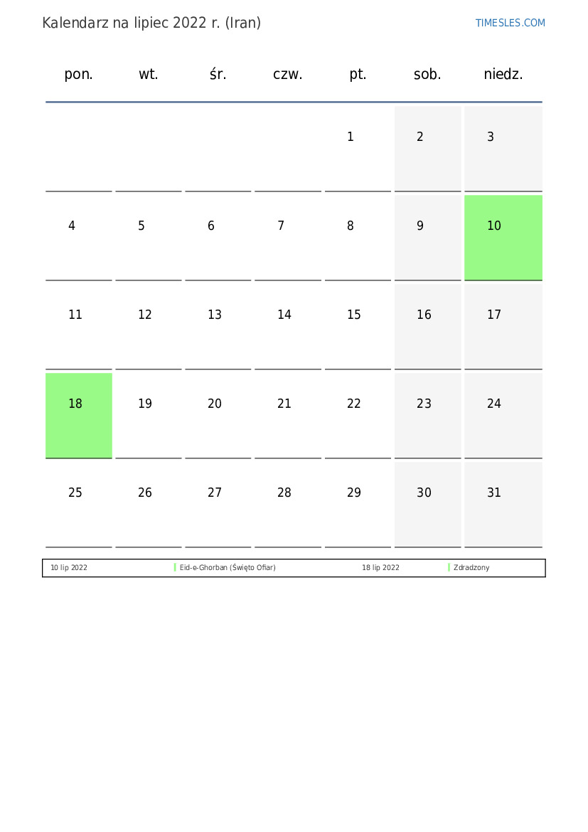Kalendarz świąt i weekendów na lipiec 2022 r. dla Iranu