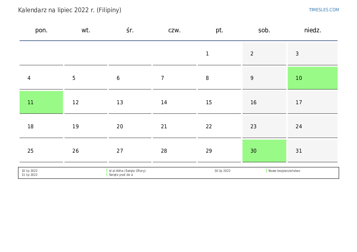 lipiec zawiera 31 dni. To 7 miesiąc 2022 r. Pora roku: lato. lipiec zaczyna się w piątek i kończy w niedzielę. W lipiec 2022 r. na Filipinach jest 3 świąt i dni wolnych.