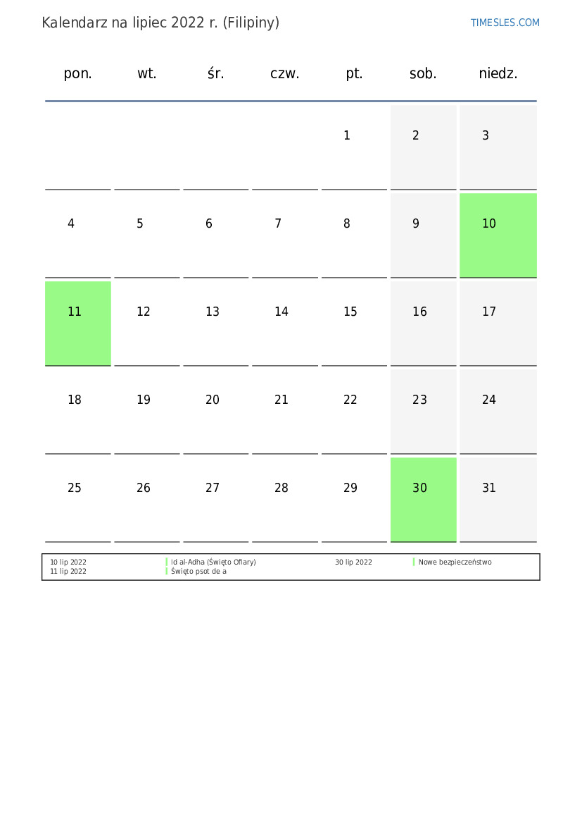 Pobierz i wydrukuj kalendarz PDF ze świętami i weekendami na lipiec 2022 r. dla Filipin