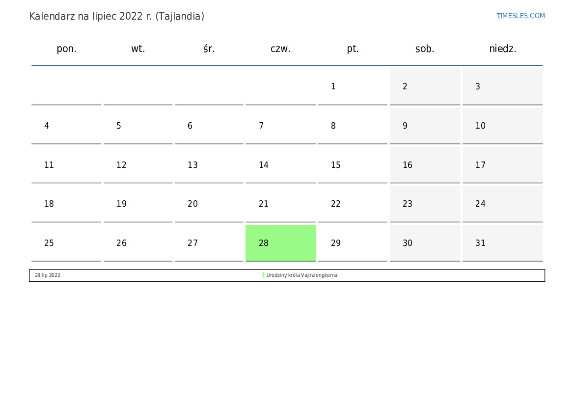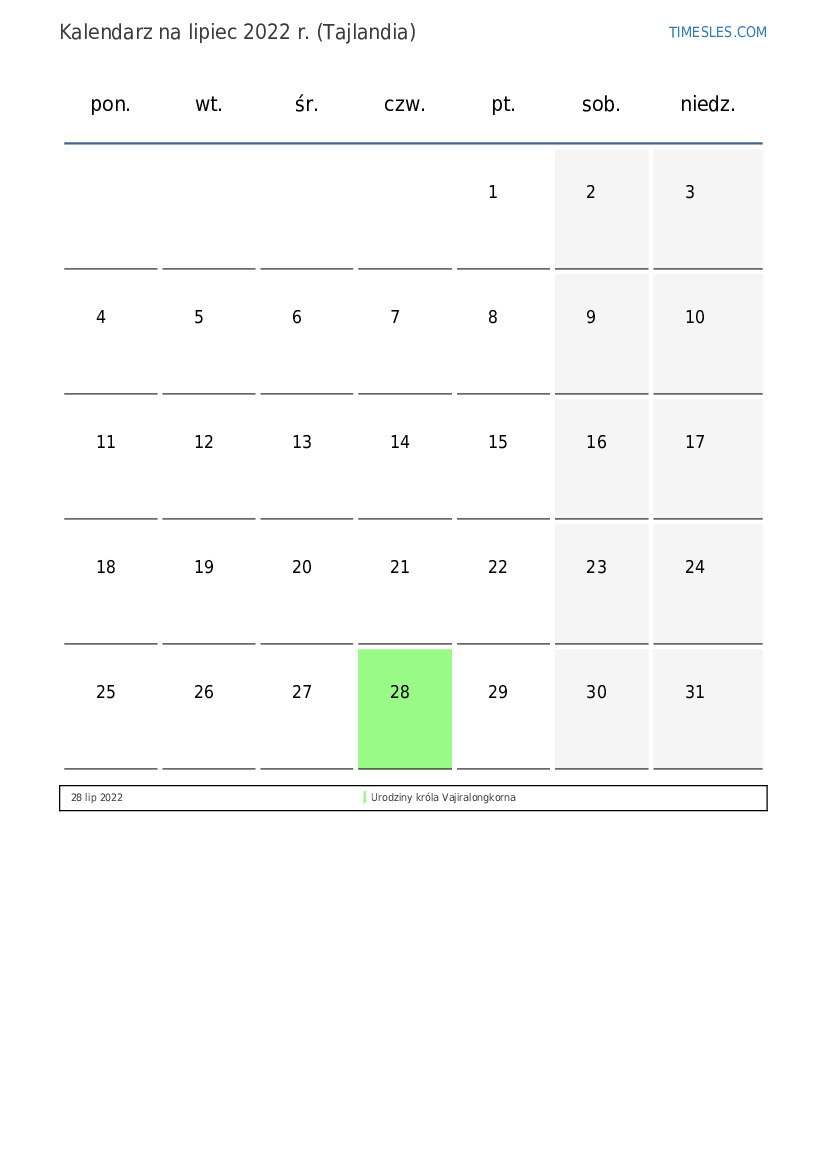 lipiec zawiera 31 dni. To 7 miesiąc 2022 r. Pora roku: lato. lipiec zaczyna się w piątek i kończy w niedzielę. W lipiec 2022 r. w Tajlandii jest 1 święta i dni wolne.