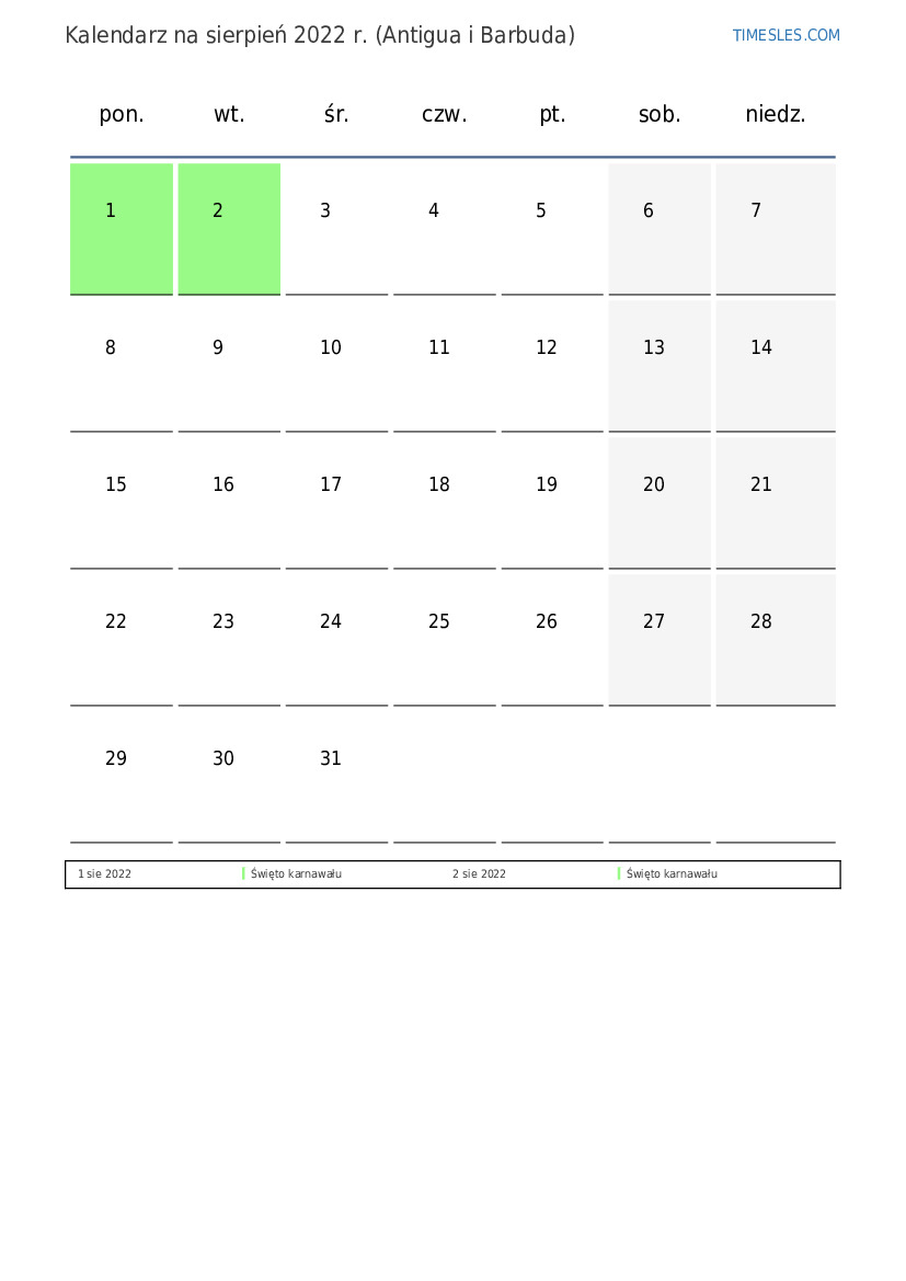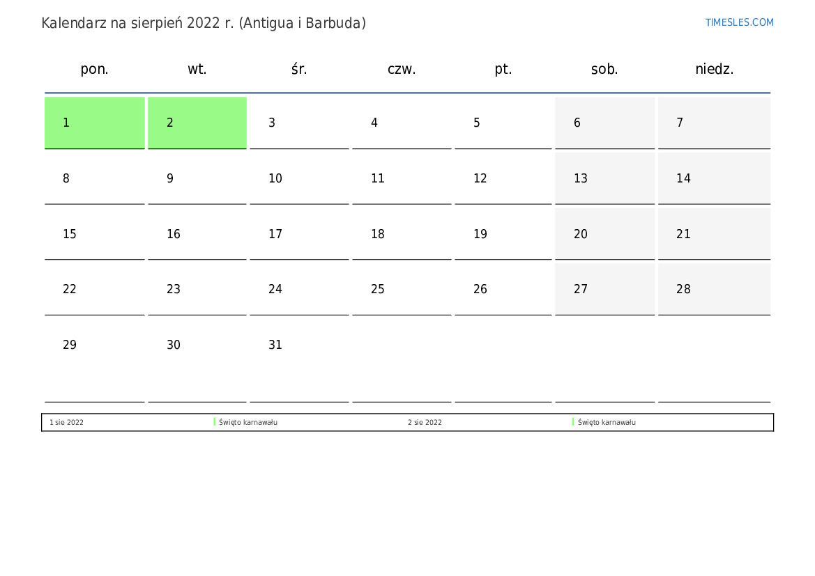 Kalendarz na sierpień 2022 r. dla Antigui i Barbudy
