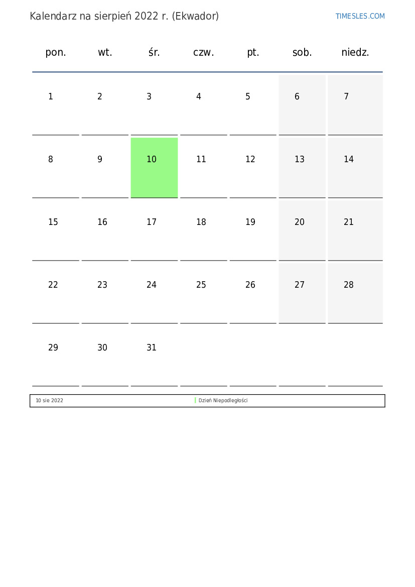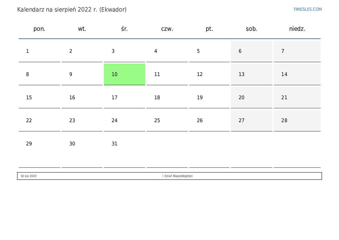 Pobierz i wydrukuj kalendarz PDF ze świętami i weekendami na sierpień 2022 r. dla Ekwadoru