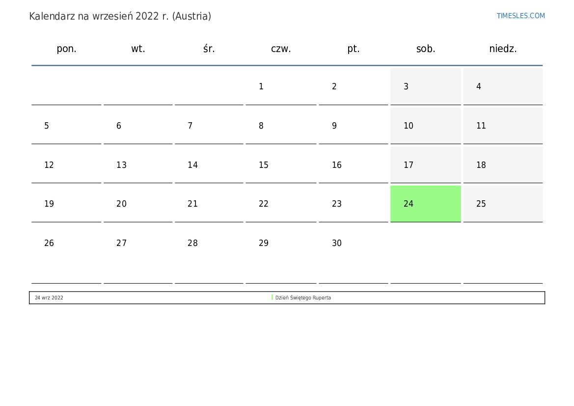 Kalendarz na wrzesień 2022 r. dla Austrii