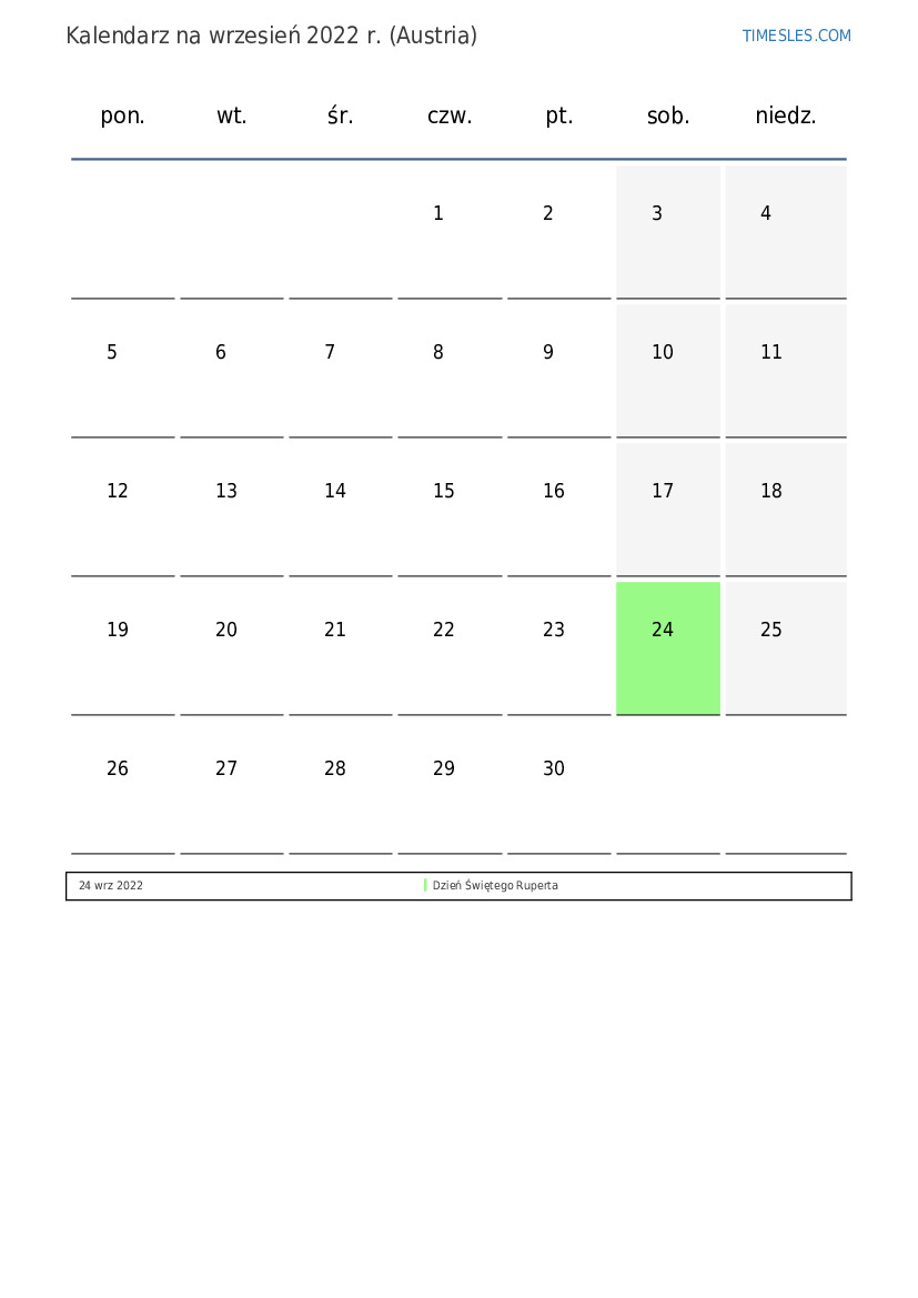 Pobierz i wydrukuj kalendarz PDF ze świętami i weekendami na wrzesień 2022 r. dla Austrii