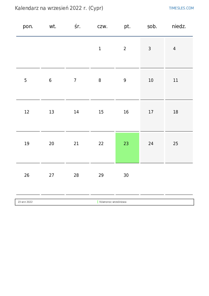 Pobierz i wydrukuj kalendarz PDF ze świętami i weekendami na wrzesień 2022 r. dla Cypru