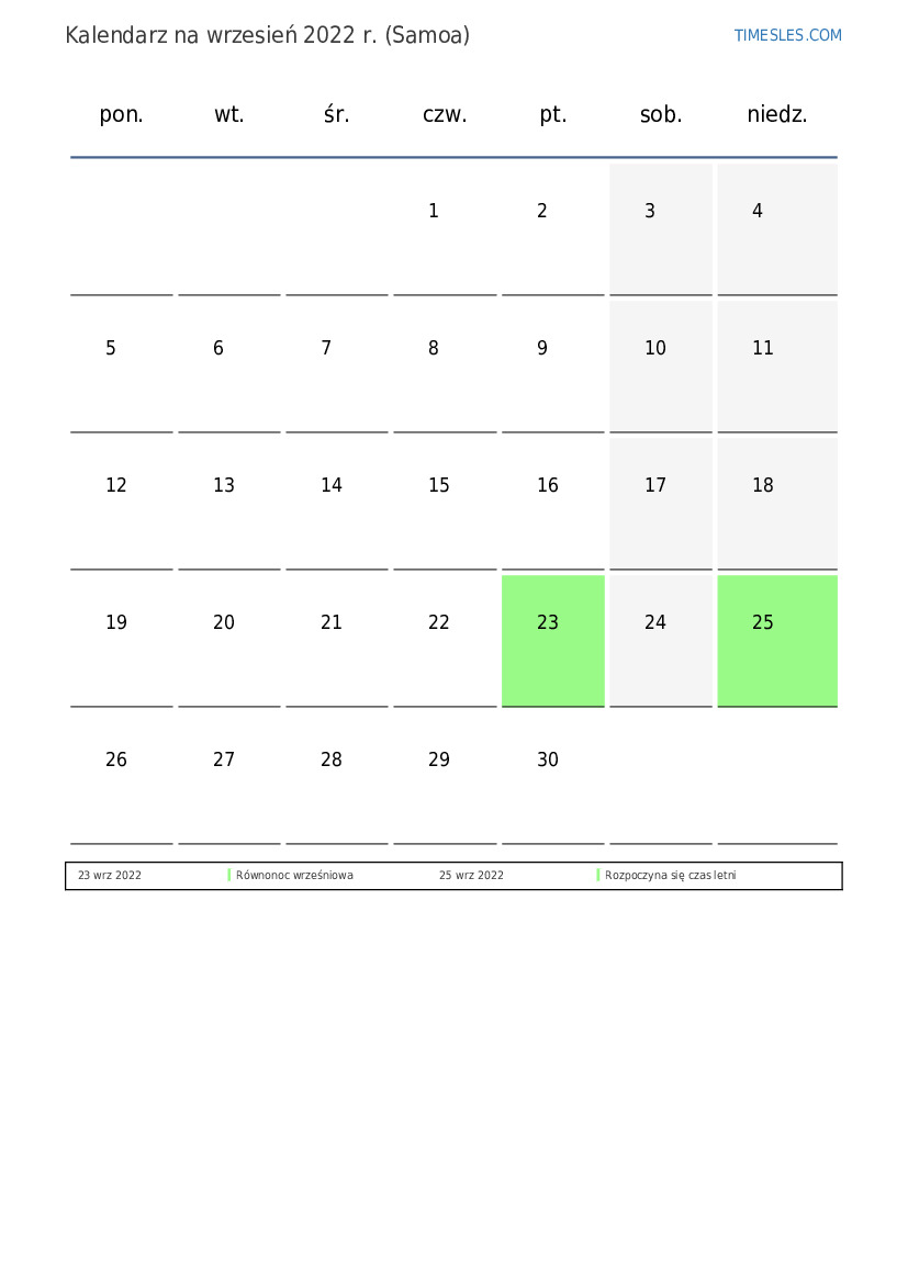 Pobierz i wydrukuj kalendarz PDF ze świętami i weekendami na wrzesień 2022 r. dla Samoa