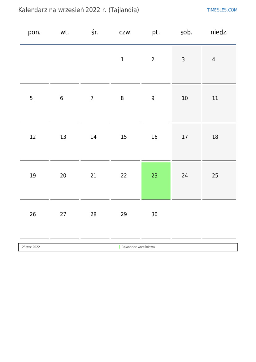 wrzesień zawiera 30 dni. To 9 miesiąc 2022 r. Pora roku: jesień. wrzesień zaczyna się w czwartek i kończy w piątek. W wrzesień 2022 r. w Tajlandii jest 1 święta i dni wolne.