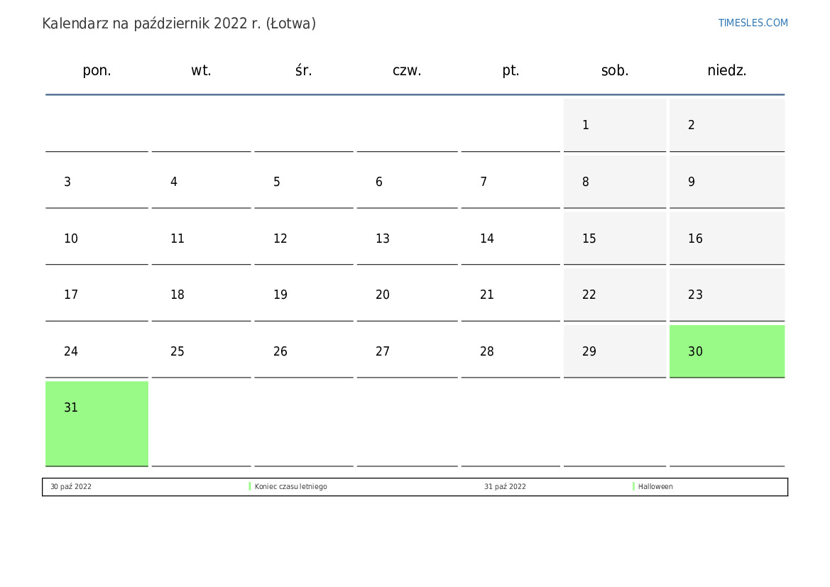 Pobierz i wydrukuj kalendarz PDF ze świętami i weekendami na październik 2022 r. dla Łotwy