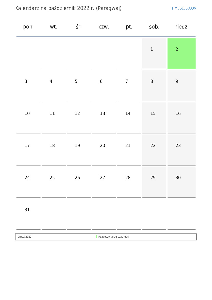 październik zawiera 31 dni. To 10 miesiąc 2022 r. Pora roku: jesień. październik zaczyna się w sobotę i kończy w poniedziałek. W październik 2022 r. w Paragwaju jest 1 święta i dni wolne.