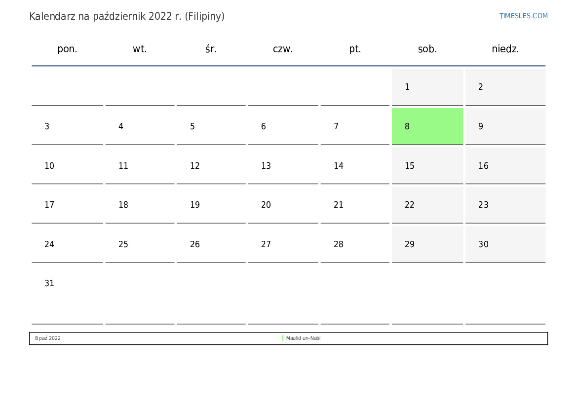Pobierz i wydrukuj kalendarz PDF ze świętami i weekendami na październik 2022 r. dla Filipin