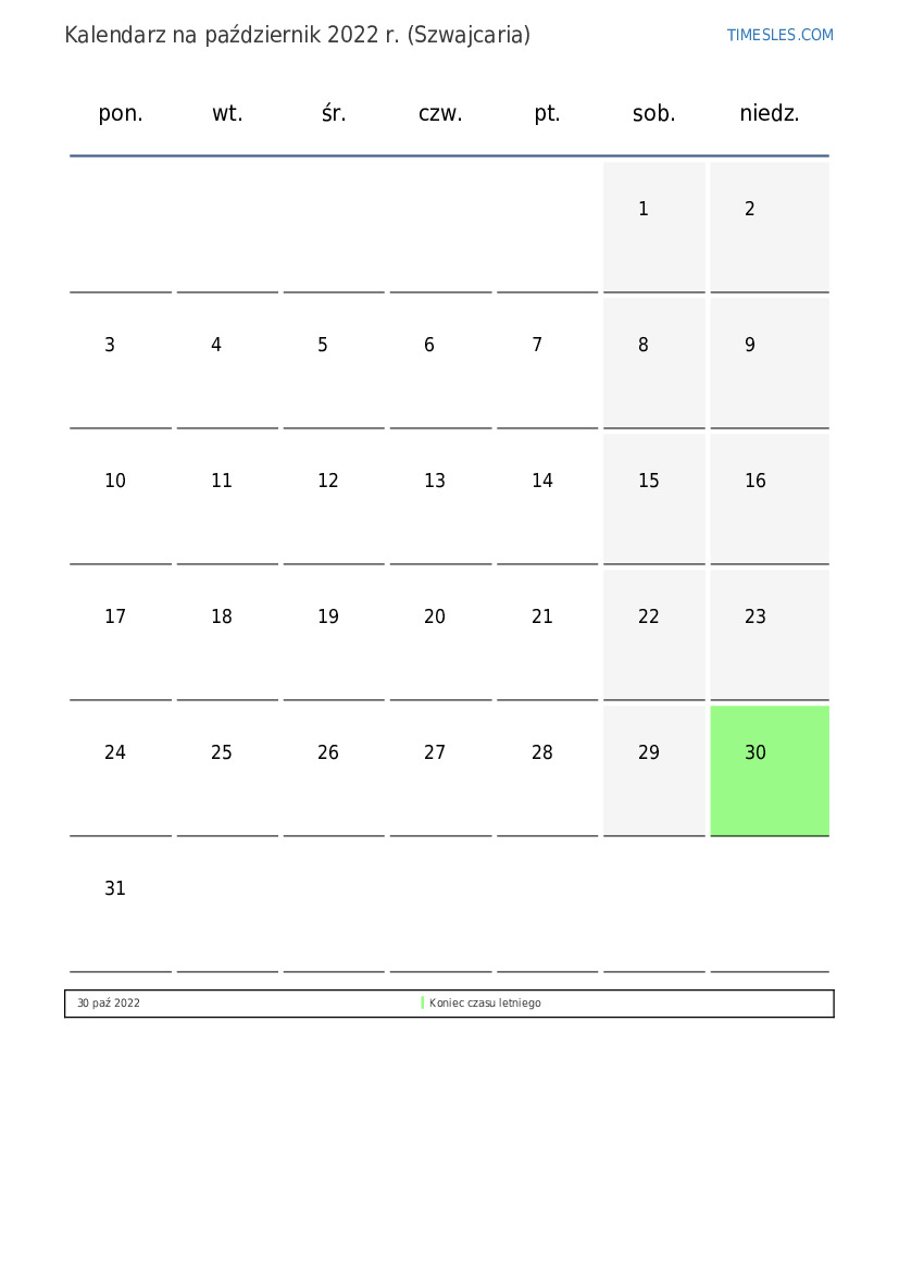 Pobierz i wydrukuj kalendarz PDF ze świętami i weekendami na październik 2022 r. dla Szwajcarii