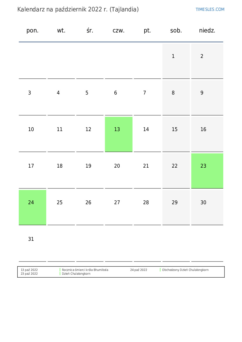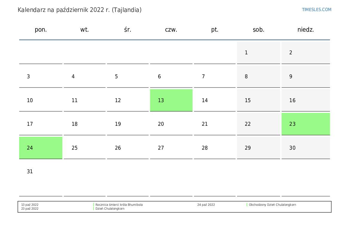 Pobierz i wydrukuj kalendarz PDF ze świętami i weekendami na październik 2022 r. dla Tajlandii