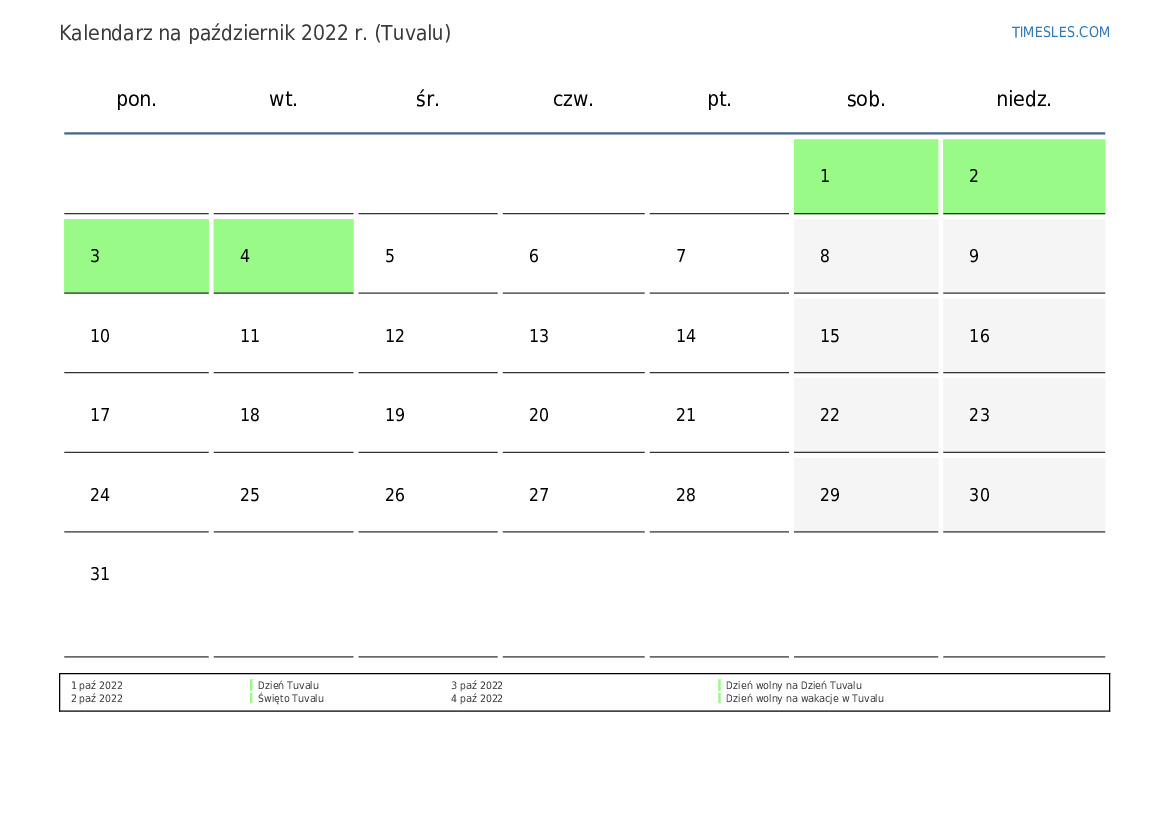Kalendarz świąt i weekendów na październik 2022 r. dla Tuvalu