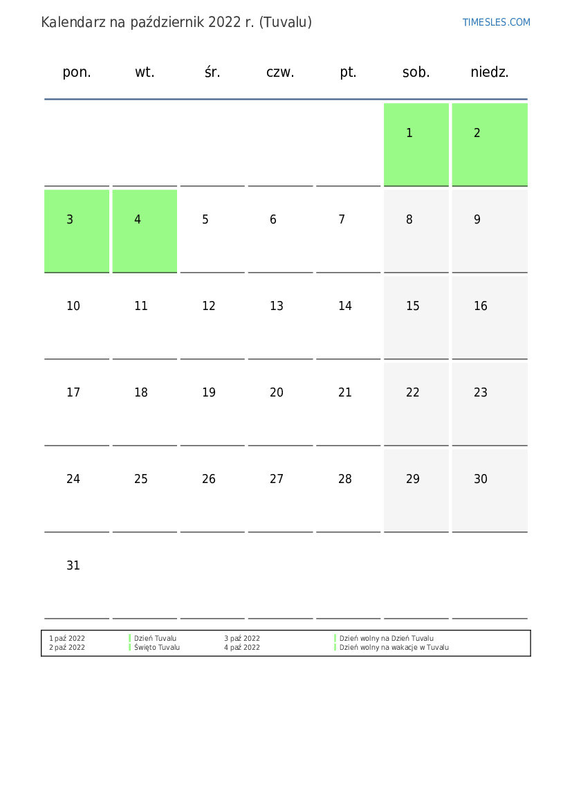 Pobierz i wydrukuj kalendarz PDF ze świętami i weekendami na październik 2022 r. dla Tuvalu