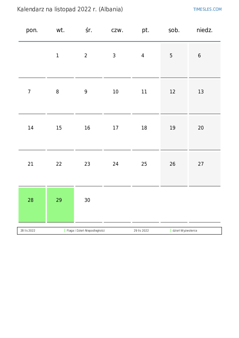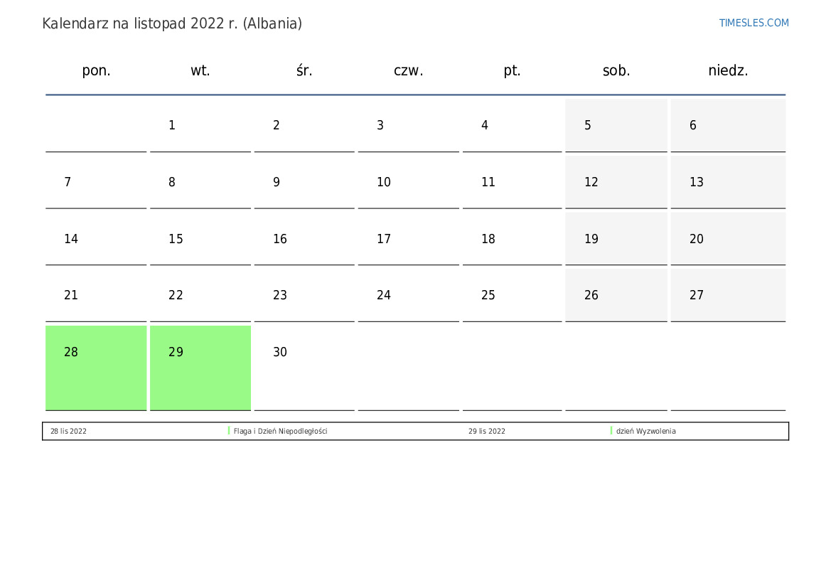 Kalendarz świąt i weekendów na listopad 2022 r. dla Albanii
