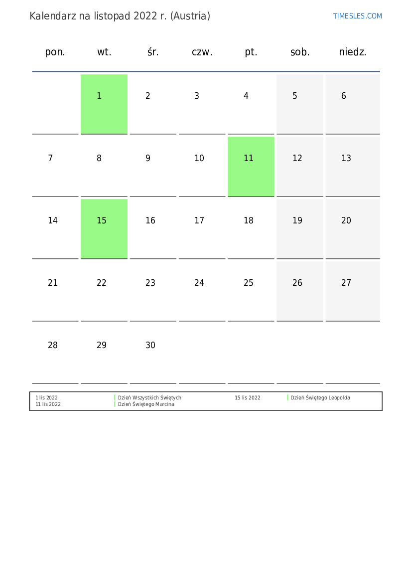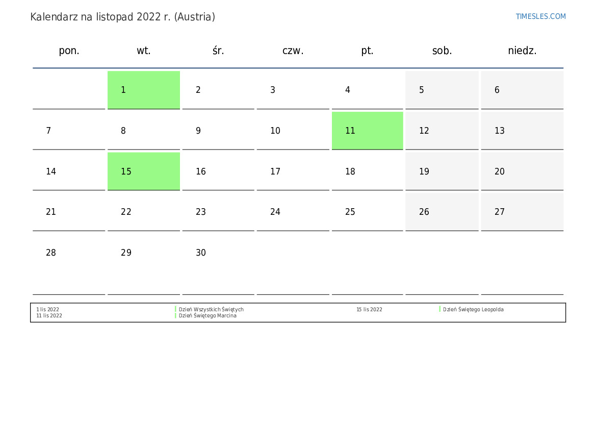 Pobierz i wydrukuj kalendarz PDF ze świętami i weekendami na listopad 2022 r. dla Austrii
